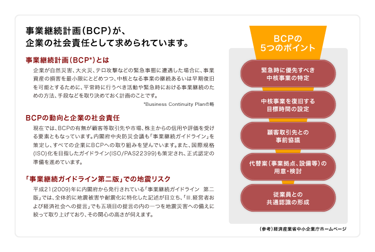 従業員の安全を保持し、顧客や自社の災害リスクを軽減することは、 いまやBCP(事業継続計画)の一環として企業の社会的責任です。まずはご相談ください。